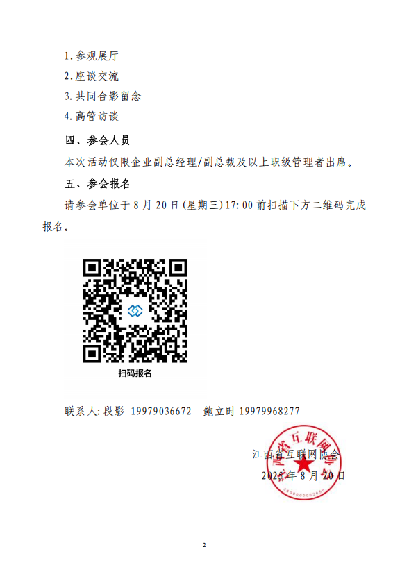 各会员单位及相关企业: 为深入贯彻国家数字经济发展战略,助力江西省互联网企业对标先进、协同创新,江西省互联网协会联合江西商报传媒有限公司组织开展“揭秘新质生产新动能 探索数字产业新路径”江西省互联网企业20强高质量发展调研行活动。深入挖掘江西省互联网企业20强的发展密码,助力江西互联网产业迈向新高度。现诚邀各会员单位报名参与,现将相关事项通知如下: 一、调研时间 2025年8月21日(星期四)全天 二、调研地点 上午:江西元聚网络科技有限公司(江西省上饶市高铁经济试验区茶圣东路东区4栋1楼) 下午:江西巨网科技有限公司(江西省上饶市信州区三清山东大道168号9-11楼) 三、主要议程 1.参观展厅 2.座谈交流 3.共同合影留念 4.高管访谈 四、参会人员 本次活动仅限企业副总经理/副总裁及以上职级管理者出席。 五、参会报名 请参会单位于8月20日(星期三)17:00前扫描下方二维码完成报名。