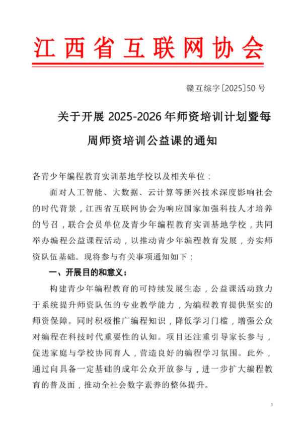 面对人工智能、大数据、云计算等新兴技术深度影响社会的时代背景,江西省互联网协会为响应国家加强科技人才培养的号召,联合会员单位及青少年编程教育实训基地学校,共同举办编程公益课程活动,以推动青少年编程教育发展,夯实师资队伍基础。现将参与有关事项通知如下: