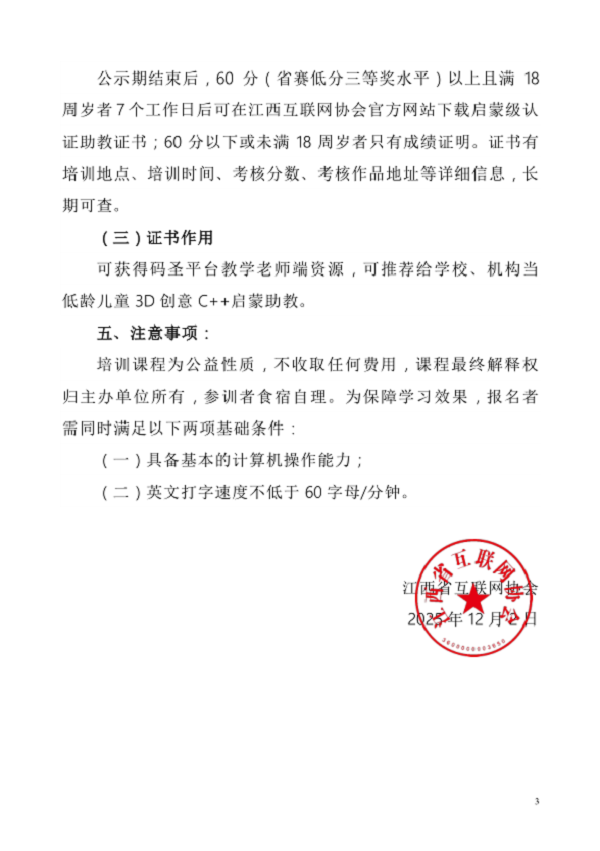 公示期结束后,60分(省赛低分三等奖水平)以上且满18周岁者7个工作日后可在江西互联网协会官方网站下载启蒙级认证助教证书;60分以下或未满18周岁者只有成绩证明。证书有培训地点、培训时间、考核分数、考核作品地址等详细信息,长期可查。