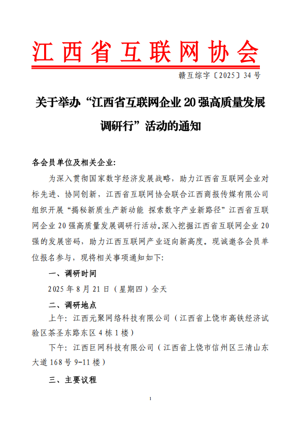 关于举办“江西省互联网企业20强高质量发展 调研行”活动的通知赣互综字〔2025〕34号