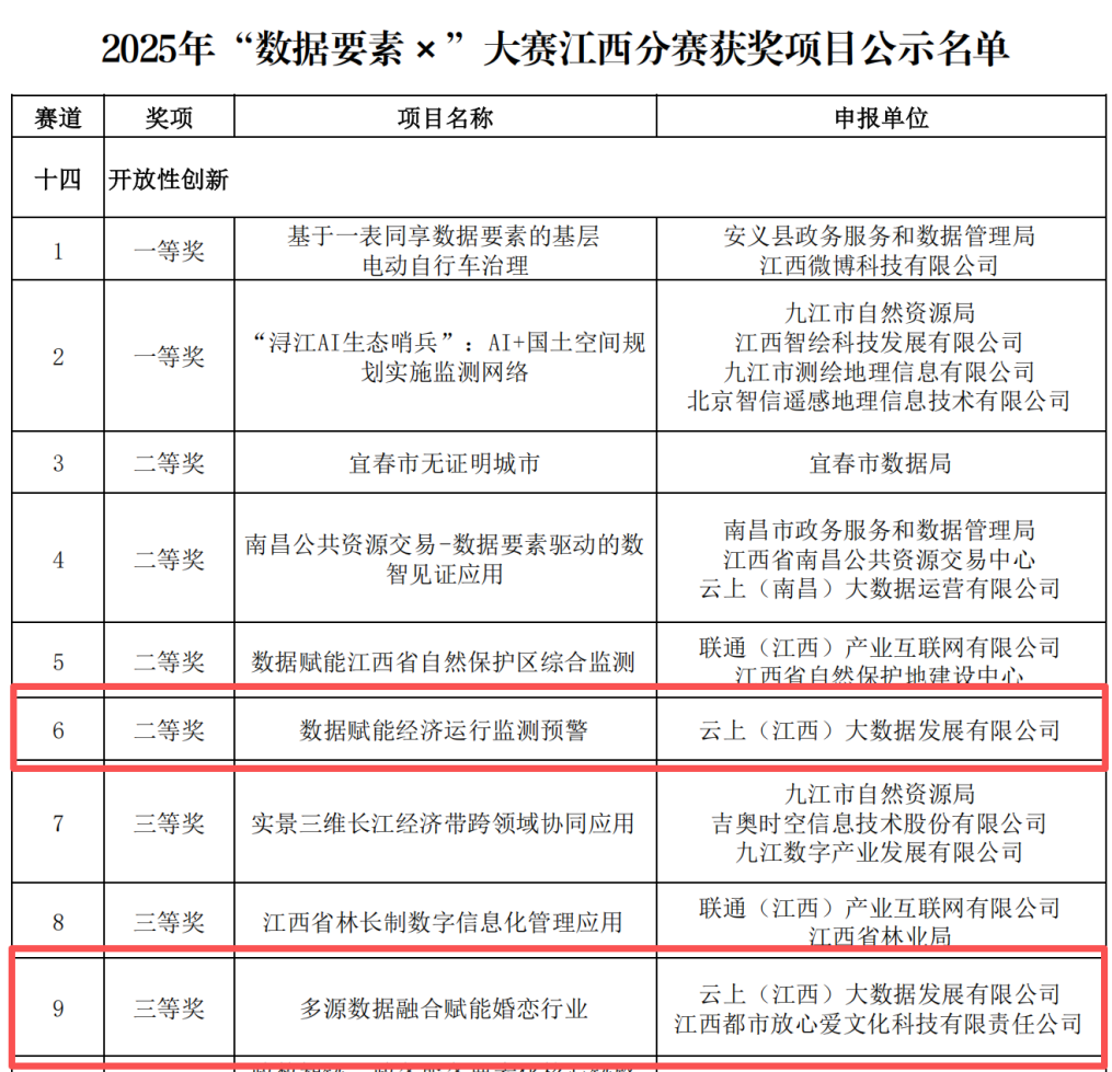 近日,2025年“数据要素×”大赛江西分赛区评选结果正式揭晓,云上江西申报的“数据赋能经济运行监测预警”项目、“多源数据融合赋能婚恋行业”项目分别荣获开放性创新赛道二等奖、三等奖。